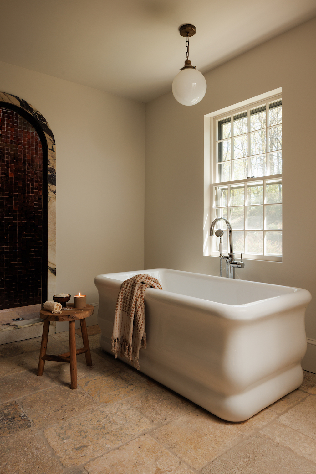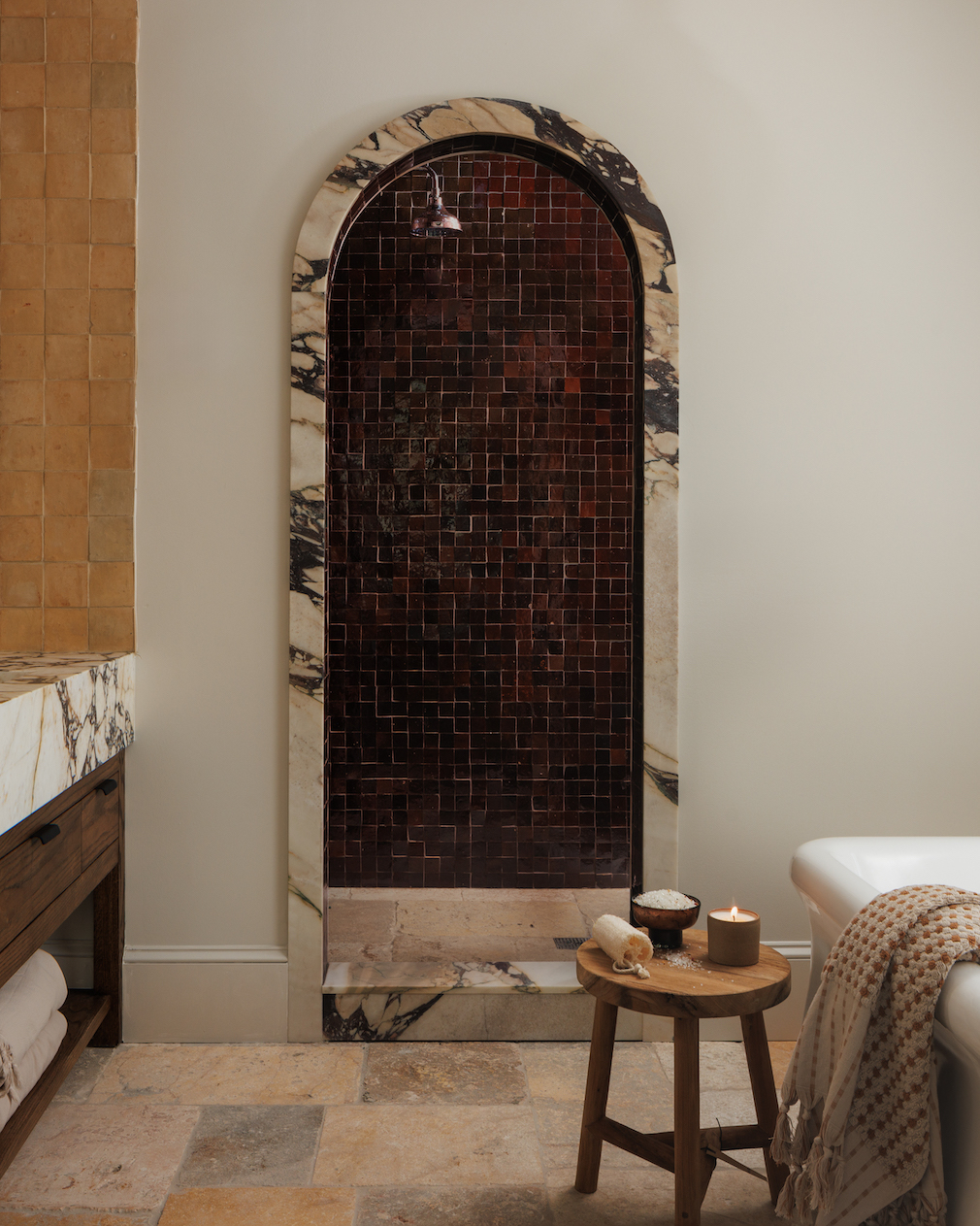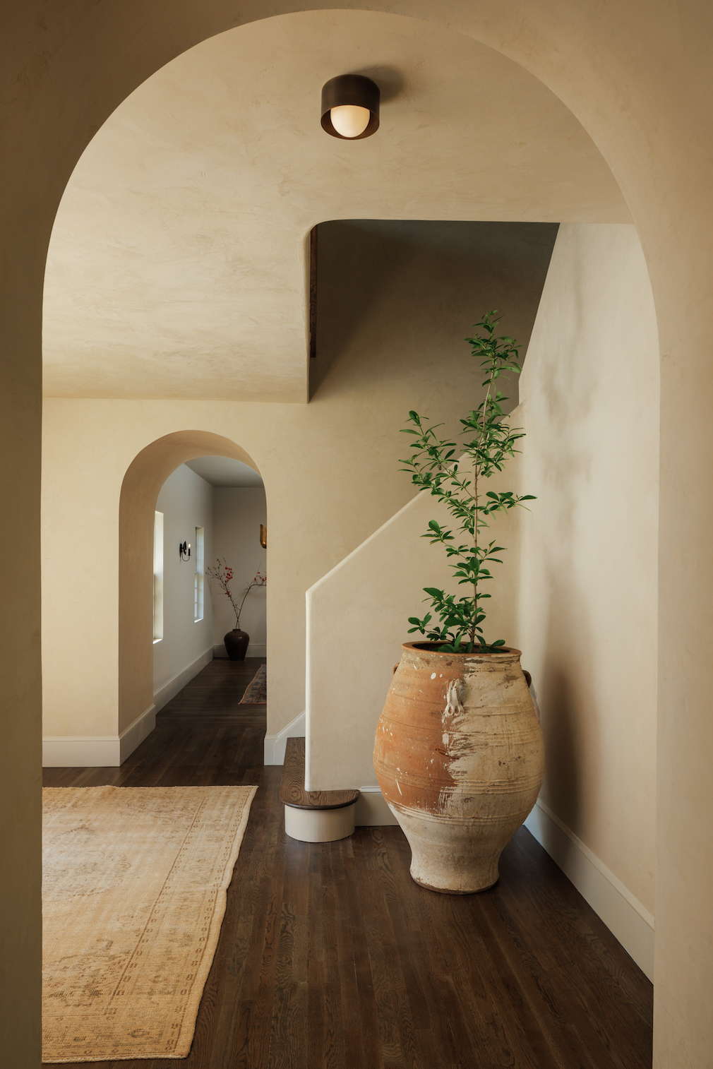 The home’s renovation honors both form and feeling. Arched passageways, hand-troweled plaster walls and three wood-burning fireplaces evoke a sense of European calm. Authentic materials — antique limestone, terracotta, aged wood — are layered with intention, celebrating the natural imperfections that lend soul and softness to a space. The result is an atmosphere that plays in quiet dialogue with light and shadow, where the rhythm of the day unfolds against a backdrop of warmth and elegance.