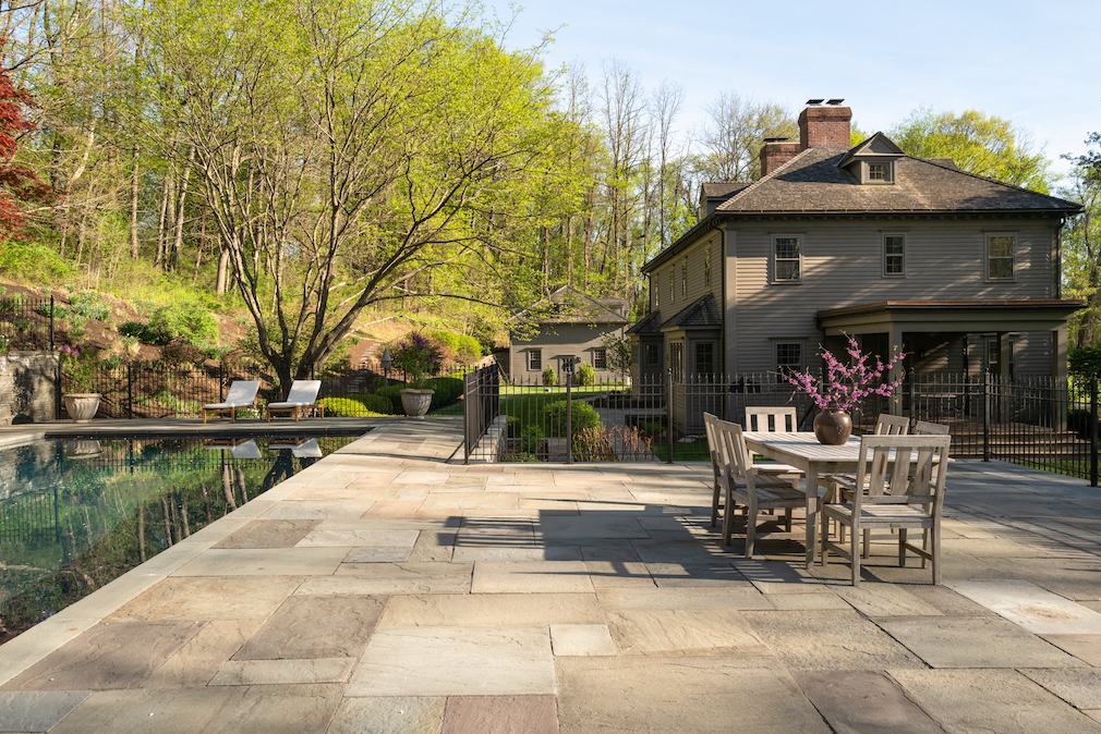 Outdoors, a gunite pool nestles into the landscape with quiet confidence. Rolling lawns give way to stone paths and pond, offering opportunities for both stillness and movement. The land, like the house, feels fluid and loved — untamed enough to feel natural, yet edited with an eye for design.