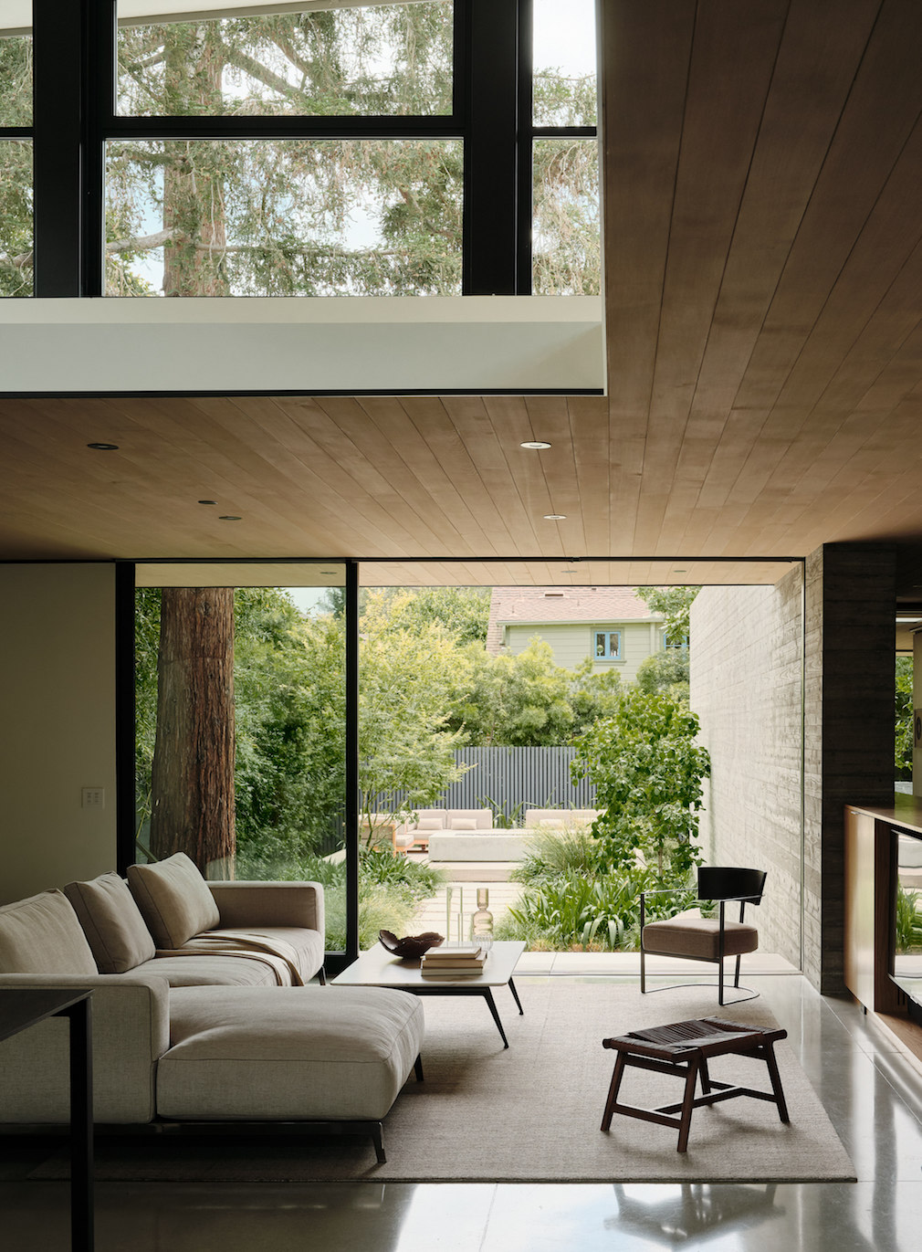 Three pavilions span the depth of the lot. The thoughtfully placed second-story apartment is designed for rentals. Below, board-formed concrete walls serve as organizing elements in the main residence which separate private from public areas. Diffused natural light streams into the space throughout the day, working gently with the clean material palette of concrete and Alaskan yellow cedar. The Sanctuary was constructed as a modern house that allows the landscape to speak first. The design features its many hidden courtyards, inviting guests to experience the same sense of wonder that first drew the clients to this urban oasis.