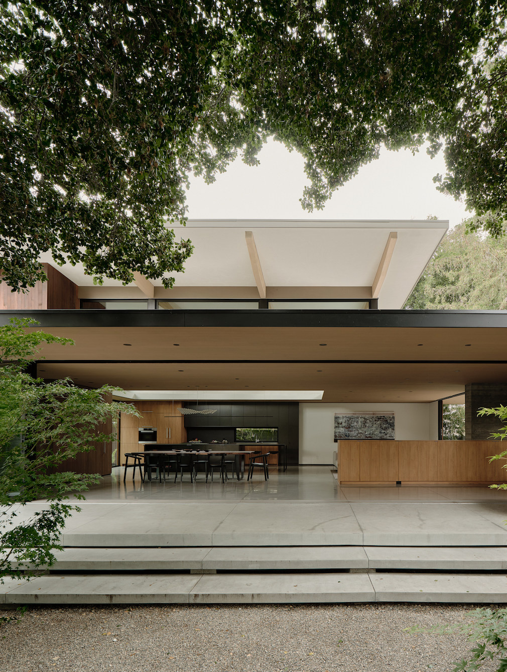 The house is sited quietly behind the large heritage oak tree with its canopy stretching across the generously sized front yard. After passing under its branches, guests are lead through a series of courtyards and view gardens that weave through the undulating footprint of the building. Each interior space is paired with its own landscape moment, allowing the architecture and landscape to flow into each other.