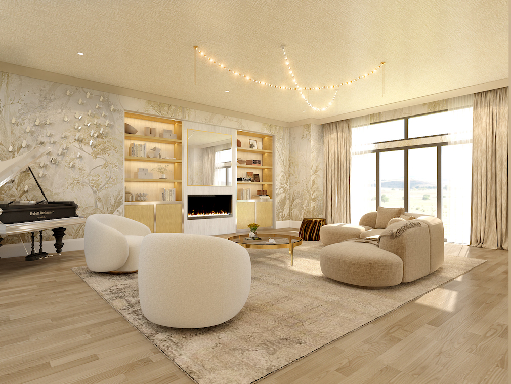 This serene and whimsical great room blends organic softness with sculptural drama. A neutral palette of creams and warm woods creates a calming backdrop for the standout design feature: a delicate ascension of metallic butterflies that dance across the walls, bringing movement and poetry to the room. Plush, rounded furnishings anchor the space with comfort, while a thoughtful mix of metals — including silvers and golds — adds layers of visual interest. From the sculptural side tables to the sleek console and built-ins, the metallic accents introduce a refined edge that brings flair and sophistication to the otherwise ethereal atmosphere. The result is a balanced interplay of nature-inspired tranquility and modern glamour.