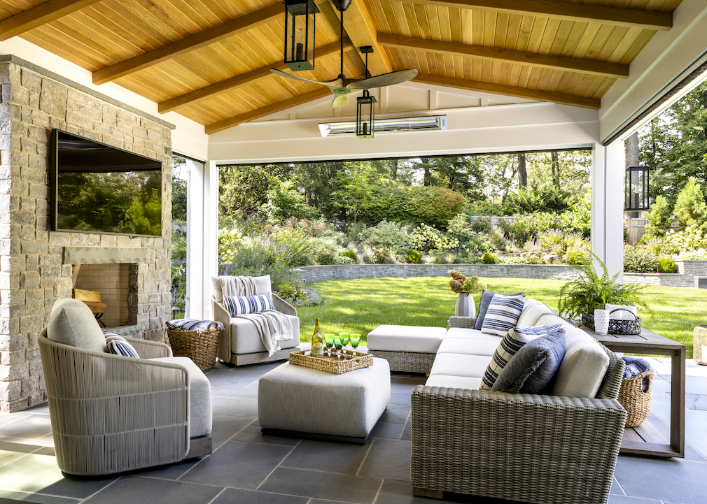 Valerie Grant: We aimed to create a living space that seamlessly connects indoors and outdoors. By incorporating an expansive Nano door, the family room opens up to the exterior covered porch. The porch features retractable screens, transforming it into a spacious three-season room that can be enjoyed year-round. With an outdoor fireplace and built-in heat lamps, it even made last year’s Christmas party a delightful experience!