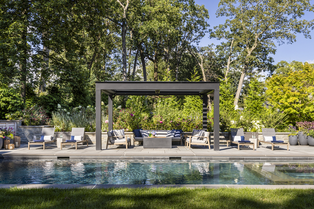VG: The backyard initially drew us to the property with its lush plantings creating a private sanctuary. We designed the exterior to offer multiple areas for enjoyment. The bluestone patio connects various spaces, including the pool area with a tranquil waterfall and hot tub, a pergola with a comfortable seating area and gas fire pit, a dining area with an outdoor kitchen, and the covered porch with another seating area and wood-burning fireplace. The layout comfortably hosts parties of four or forty. People can gather together or split up in small groups. We enjoy spending family time there and have hosted large events, like our daughter’s graduation. Each space offers something unique, making it perfect for entertaining.