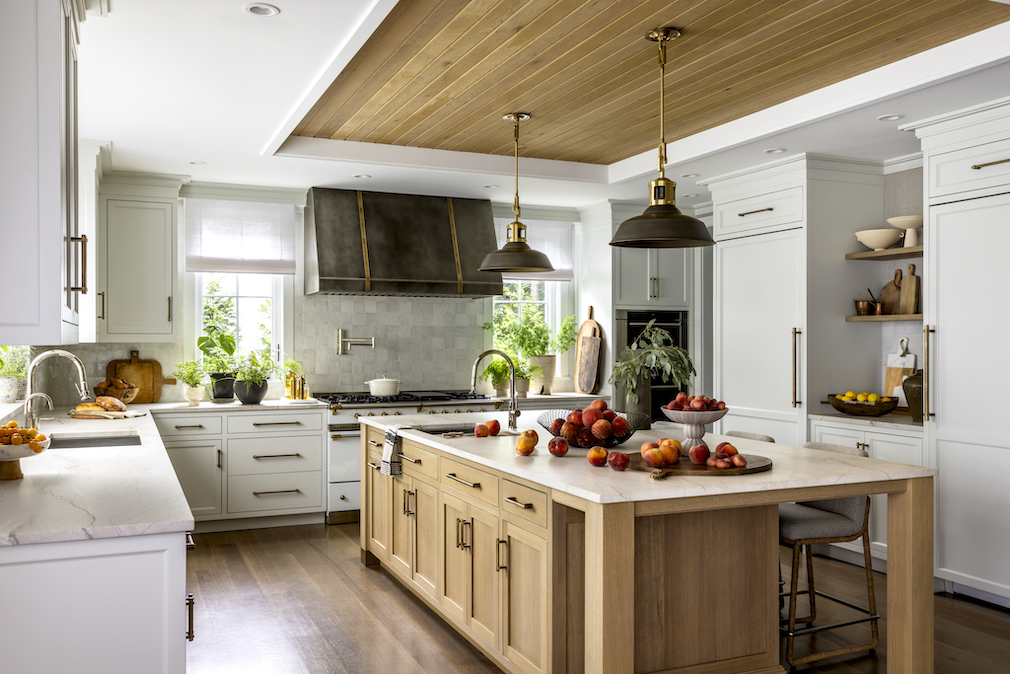 VG: The kitchen was designed for both cooking and entertaining, with an open layout that connects to the outdoor area. We love to cook and we love to host friends, so I wanted the kitchen to feel warm and inviting. I chose off-white paint for the cabinetry, combined with warm light oak wood tones, burnished metal accents, and light quartzite countertops. The Lacanche range and custom metal range hood serve as focal points. To maintain an open feel, I included a custom metal cabinet with glass doors and light oak open shelving. Key features also include a galley sink in the kitchen island, a pot filler, a secondary wall oven and an adjacent desk area.