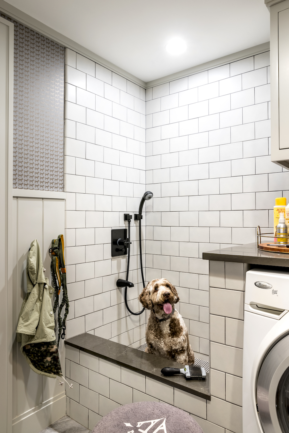 VG: The basement is another key area, equipped with amenities for all its inhabitants and guests, both human and canine. For my avid golfer husband, I created a golf simulator room. There’s a laundry room, mudroom, and a dog shower for our two dogs. Given that our children are college athletes, we included a fully-equipped gym with a sauna for their use during school breaks. This house was designed to be used to its full capacity!