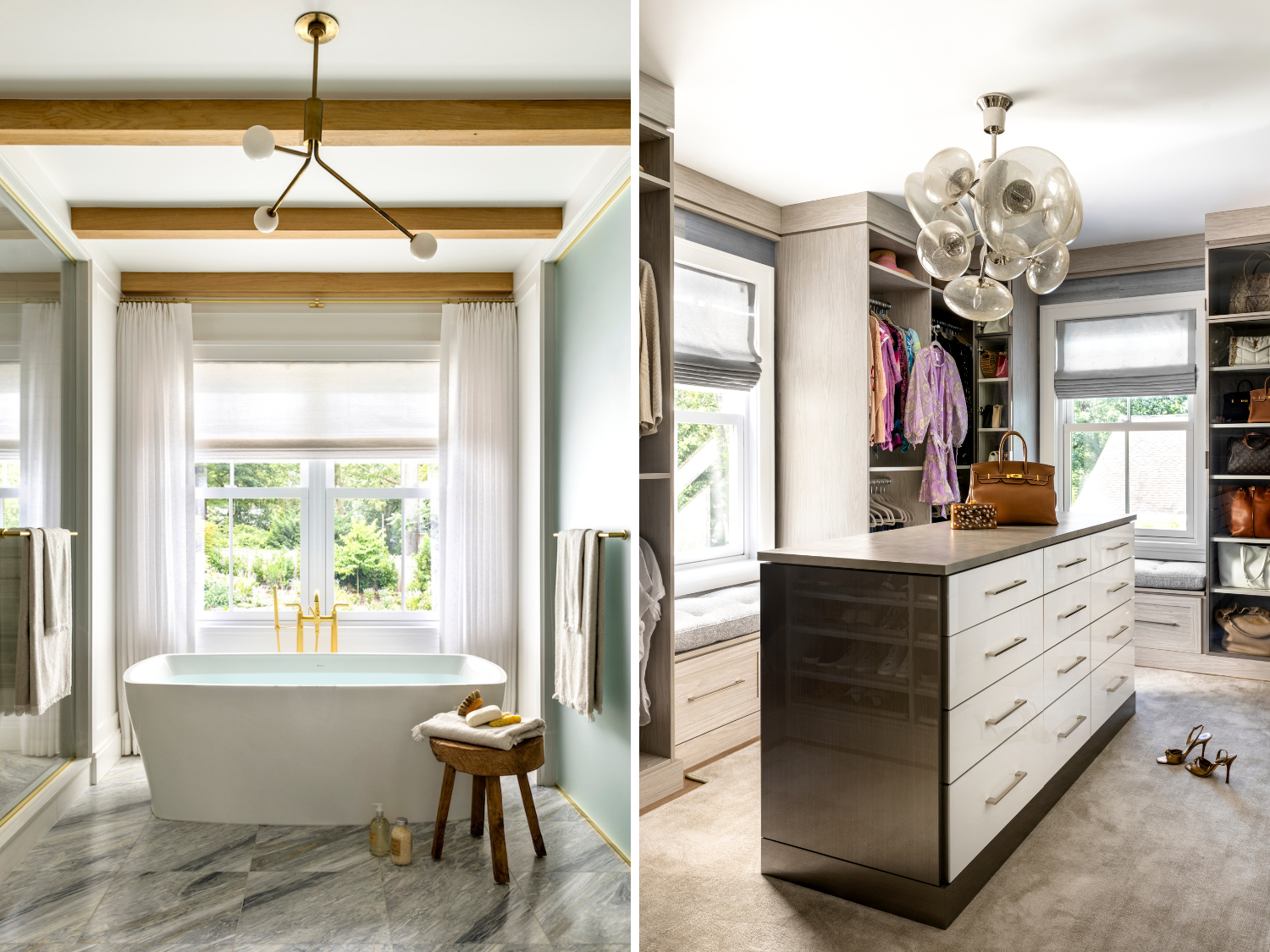 VG: The primary bedroom was designed as a tranquil retreat, featuring a large window overlooking the backyard, a light oak plank ceiling and a cozy seating area. The primary bath is infused with natural elements, showcasing Calacatta Bluette marble tile and countertops, with wood tones carrying over from the bedroom. Custom vanities and a dressing table with burnished brass inlay add to the luxury. The soaking tub in front of the large window is perfect for unwinding. However, my closet is my favorite feature. Coming from a fashion background, I wanted it to feel like my favorite boutique, with luxurious finishes, ample storage, and an adjacent seating area. In the past, I’ve always designed my closets with closed cabinetry; this time I wanted to have fun and put everything on display! I absolutely love it. It really makes getting ready in the morning both easier and so much more fun.