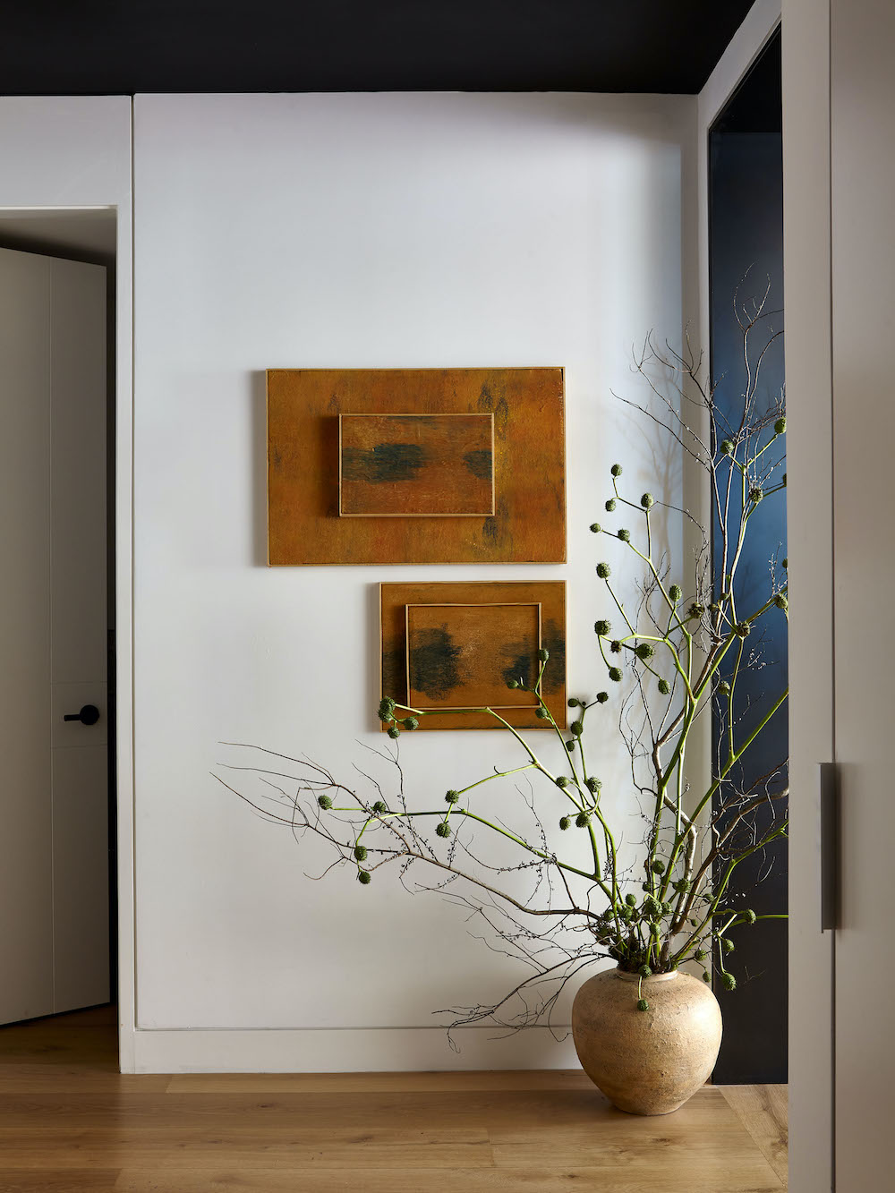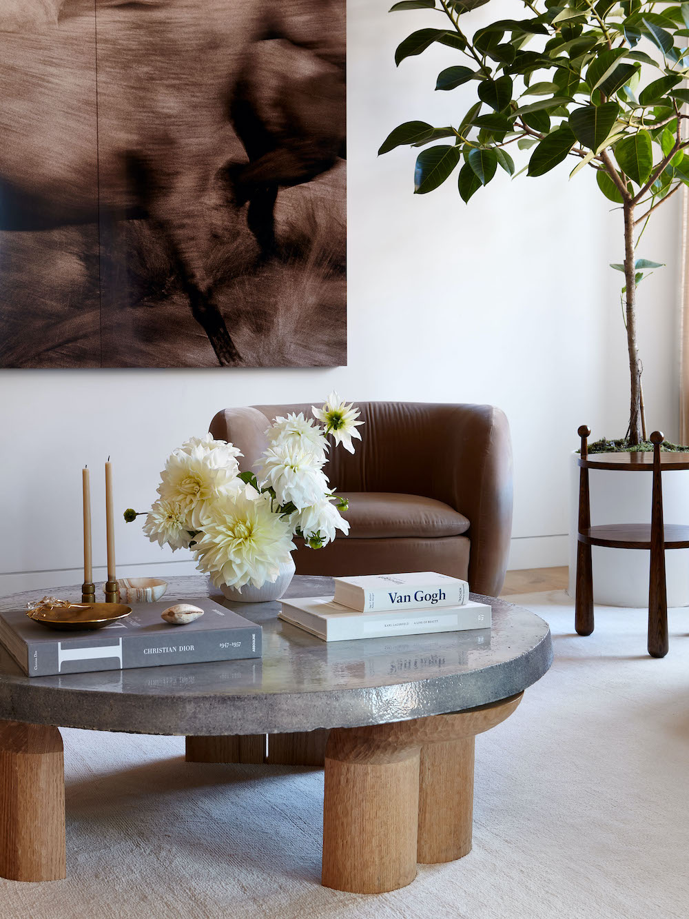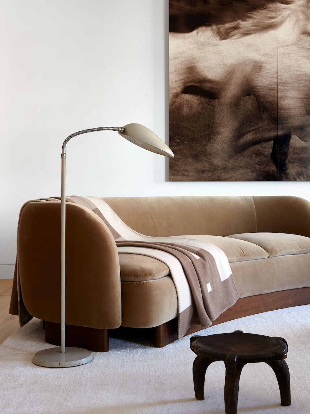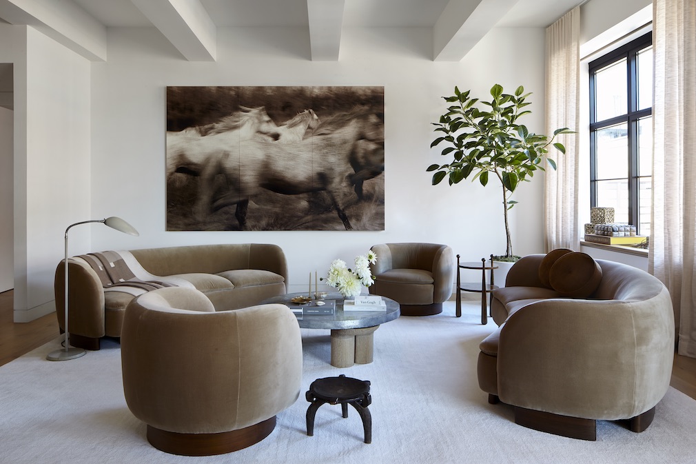 VP: Among the notable pieces are Joe Henry Baker artwork in the entry; living room accents like the floor lamp by Greta Magnusson Grossman/GUBI, Running Horses photograph by Robert Faber from The Selects Gallery, Quille side table from Maison Royère and Sachita coffee table by Ian Felton Studio; as well as Brutalist chairs from De Puydt and Aegean pendant light by FEYZ Studio in the dining room.