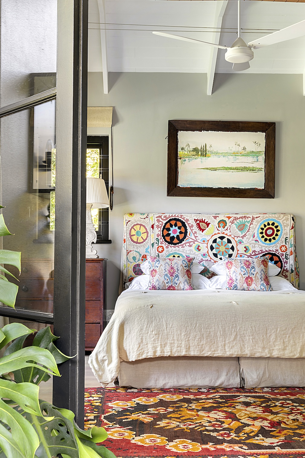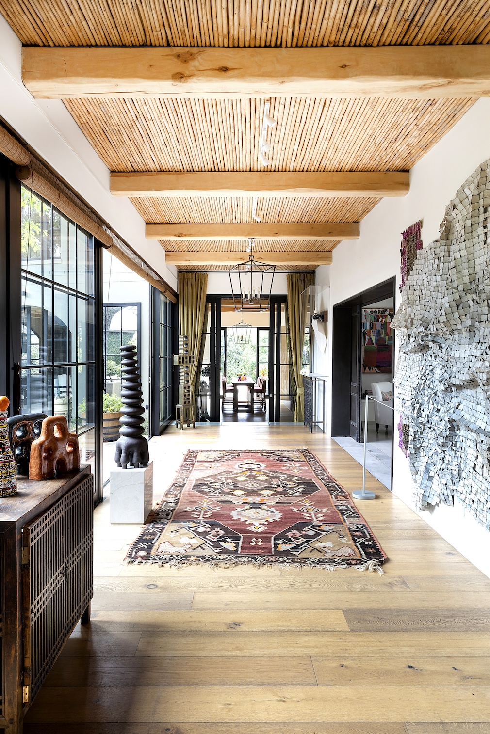 “Nourishing” is a word that Savigné echoes when describing her home, nodding to her inclination for feel-good interiors. To this end, the bounty of her travels permeates each room, breathing life into its bones. A cachet of hand-knotted rugs and vintage textiles swathe chairs, beds and sofas in lieu of branded, upholstered ones, evoking a sense of origin. “Established furniture that has texture is like having old trees; it brings instant stories and gravitas,” she notes. To further comfort and embrace, she has teamed oak floors with rietdak (reed) ceilings and poplar beams and wrapped the walls and ceiling of her living room in a custom paint by color designer Freya Lincoln. The hue – a mottled, sun-baked clay – was glazed for added depth.