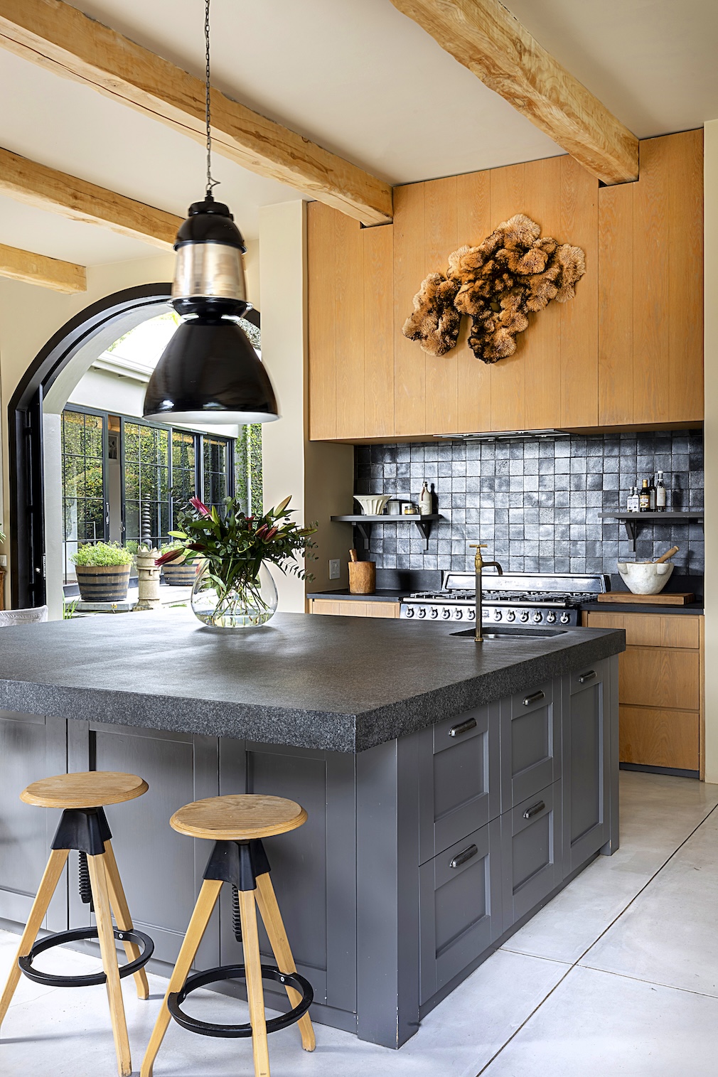 Gazing at Devil’s Peak and Kirstenbosch National Botanical Garden through an endless canopy of trees, Savigné’s home conceals its generous scale within an intimate, U-shaped layout, enveloping a lush courtyard at its nexus. Shouldered by wings of bedrooms – three upstairs for Savigné and her children, three downstairs for her guests – the heart of the home is where the ebb of life unfolds. From here, her open kitchen, bar and dining area tumble out to the courtyard on one side and to a long veranda on the other.