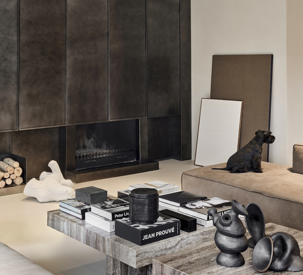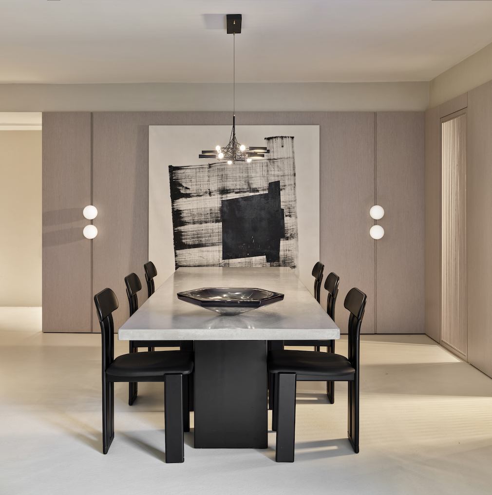 Through the use of a single material – microtopped concrete – Karavil skillfully allowed the design and art to be the primary focus against this simplistic base. The floor plan, which allows for indoor-outdoor living, provides a cocoon-like effect as natural light flows between rooms. Layered textures of leather and suede in gray, cream and black tones reinforce the masculine furniture selection and standout art pieces. In the living room, sculptures by Turkish ceramic artist Merve Kasrat rest atop a pair of custom marble coffee tables.