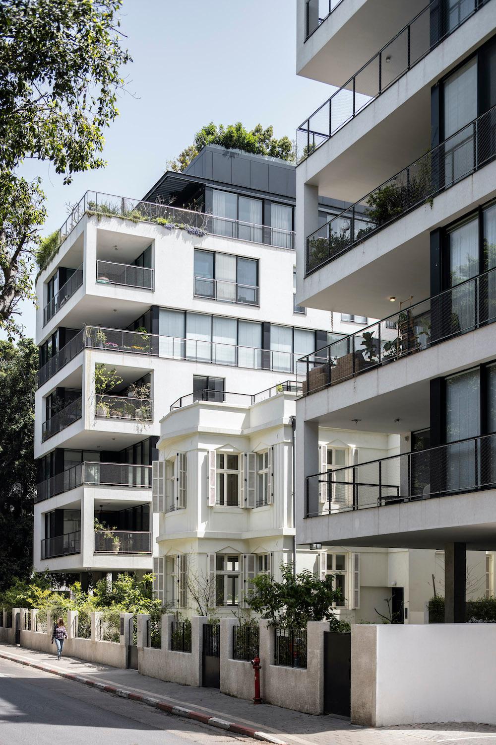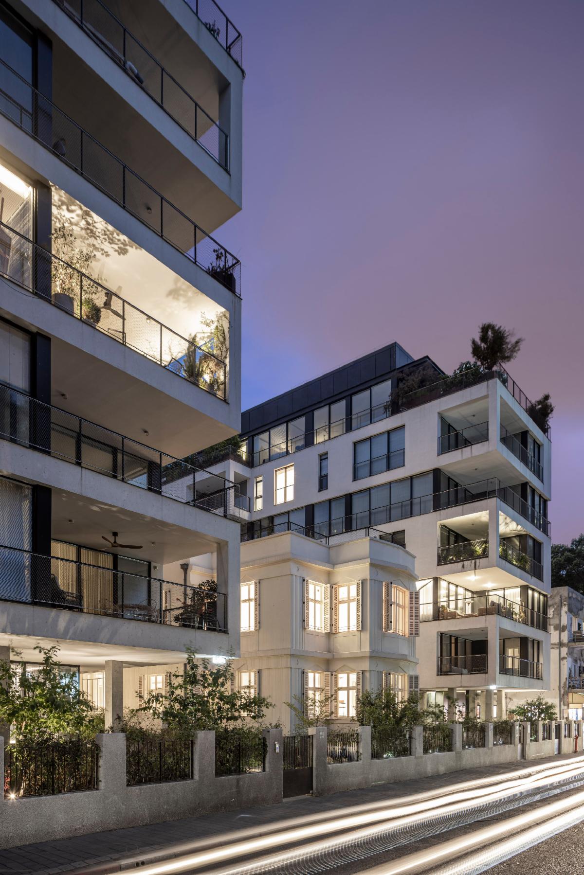 The project’s two new buildings were designed as a reflection of one another and a juxtaposition to the Eclectic-era villa that sits between the contemporary structures. Together, the three buildings create an additional and modern layer in the urban fabric of Tel Aviv, and an example of the architectural development of the city’s new class of residential offerings.