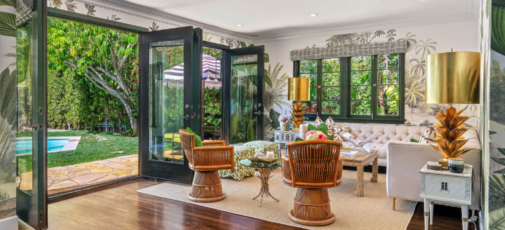 The lower-level sunroom transports you to a brand new destination. Rattan chairs sourced from 1stDibs and tropical Ananbo wallpaper are tied perfectly together with gold and evergreen accents and dark stained wood flooring. You might think you are vacationing in a jungle villa as you relax here to sip on sweet drinks before stepping outside to sunbathe, or if you decide to enjoy a nighttime swim after warming up next to the outdoor fireplace. The lushly landscaped yard invites easy indoor-outdoor entertaining areas for dining alfresco.