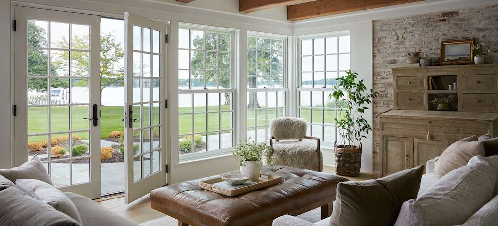 Multiple windows frame river views in the kitchen’s dining area. “One of the biggest appeals of the property is its waterfront location near the Chesapeake Bay,” Weeth noted. “We wanted to make sure the outdoor spaces felt connected with the understated interiors while allowing the views to take center stage.”