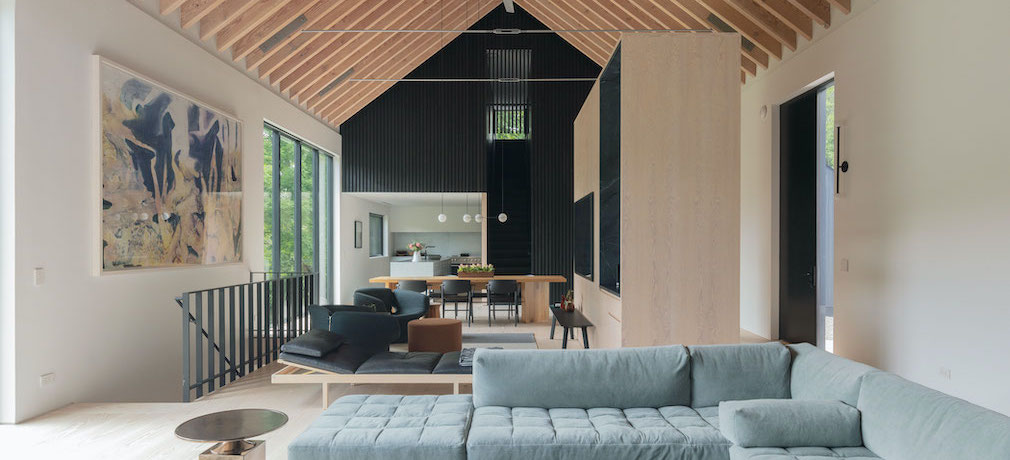 The studio gut renovated and expanded the main home (originally a converted dairy barn) and added a ground-up garage/studio, and spa shed. The three buildings iterate on the archetypal gabled form of the American barn while also distinguishing themselves with varying approaches to cladding and material detail. “We didn’t want a monotonous experience of moving from one dark clad building to the next,” says co-principal Jejon Yeung. “As a whole, we read the collection of buildings as siblings that are closely related—like cousins.”