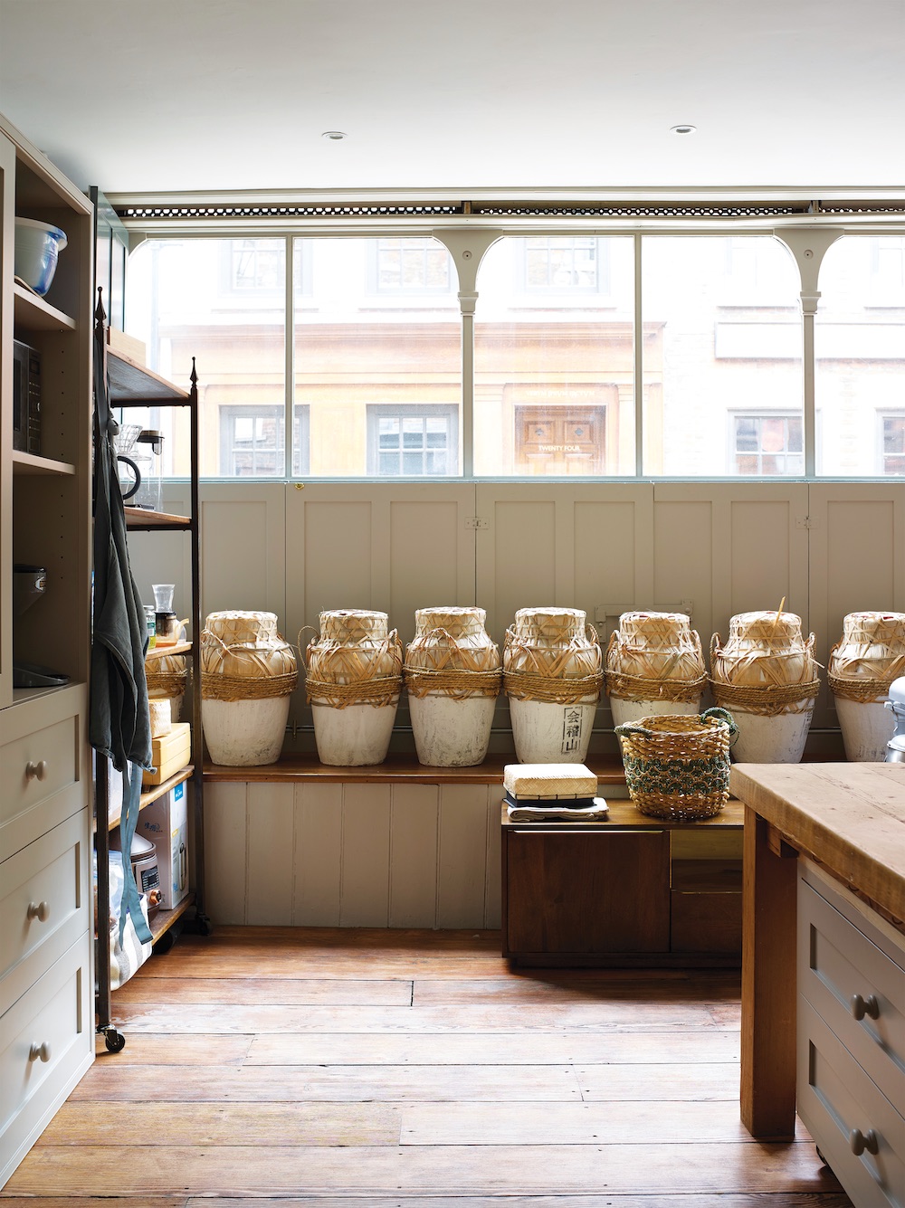 Subtle and indirect, evident but not overwhelming, Z’s cross-cultural exercise constitutes a conversation, not a lecture. Here and there (on a windowsill, in a fireplace) she has deposited large, glazed jars, in which she ages Shaoxing wine, the rice-based brew that originated in Eastern China. The atelier-like living room sports a panoramic chinoiserie wallpaper from Ananbô. Refreshingly underpopulated, the skylighted space is home to various eBay finds (including a wood-framed armchair reupholstered with a House of Hackney fabric) and curious objects, such as a basket picked up from a Bangladeshi grocer down the road.