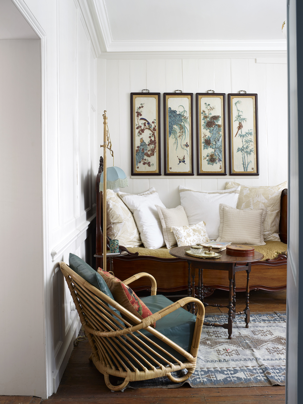 In addition to their restaurants, which include Bun House in Chinatown and Wun’s Tea Room & Bar in Soho, the couple operate a bed and breakfast down the block from their home. Like the streets outside, where newly christened hipsters mingle with longtime residents, these interiors ride on a wonderful commingling more engagingly random than arduously arranged (think a less studied Soho House). In one room, an Arne Jacobsen Charlottenborg Chair forms an unsuspected partnership with a dark, time-worn tea table. Elsewhere, a vintage rattan table and chairs are grouped with a daybed repurposed from an old wine rack. But a taste for traditional arrangements has a place here as well. A bedroom is outfitted with a not-too-old, curtained four-poster bed, a rosy-hued velvet sofa set at its foot. Like Spitalfields itself, where the past is ever-present, Z’s interiors are not quite here and not quite there. Neither wistful nor twee, they are just about right.