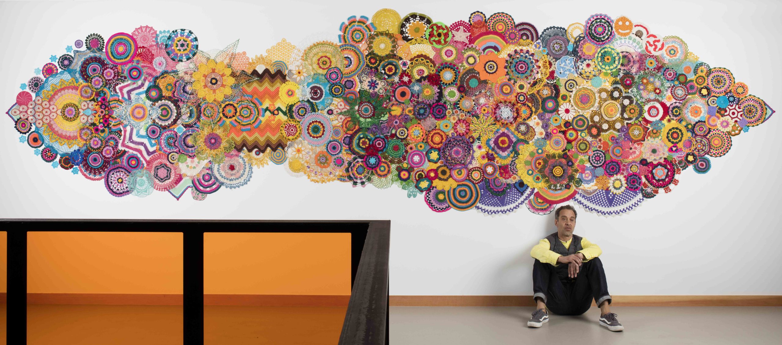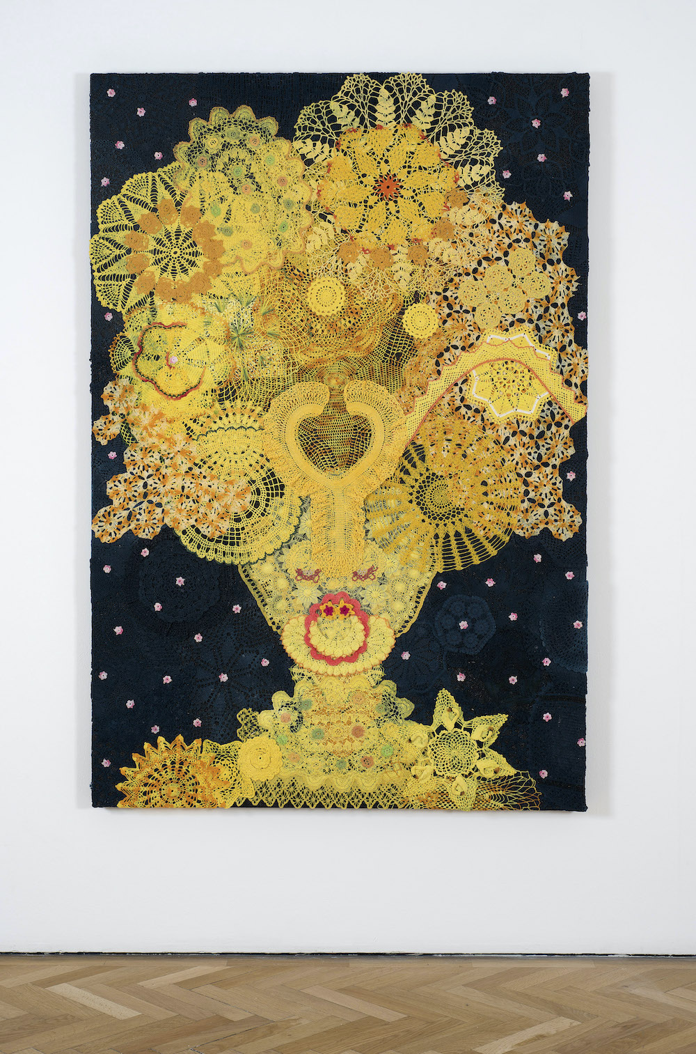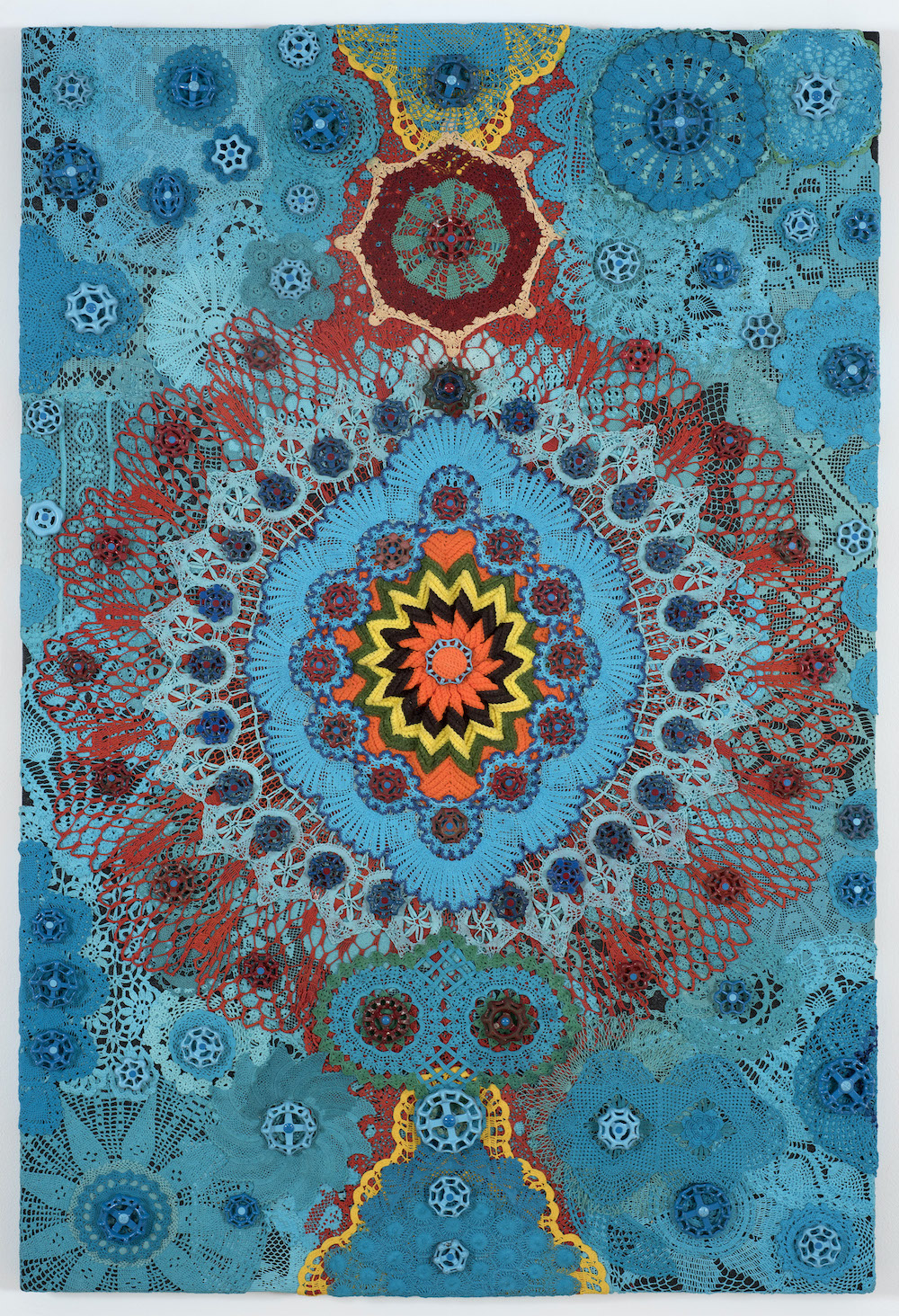 Because making doilies was traditionally a woman’s craft, this reexamination allows Ové “to work in a feminine sort of way.” The works recall Xenobia Bailey’s large-scale crocheted wall pieces and mandalas. The costume aspect and the musicality inherent in the visual rhythms Ové creates with the doilies also hark to the Soundsuits of Nick Cave. But their riotous color and pattern, what the artist calls “grandmother psychedelia,” can also remind us of Takashi Murakami’s dense agglomerations of neon-hued daisies and smiley faces.