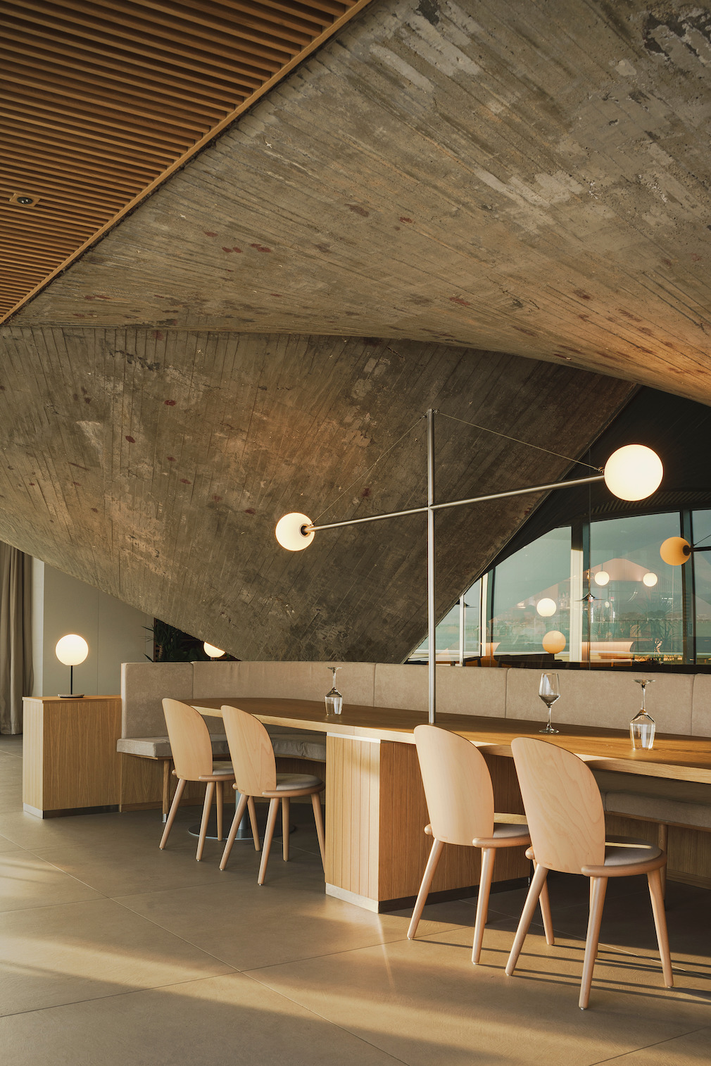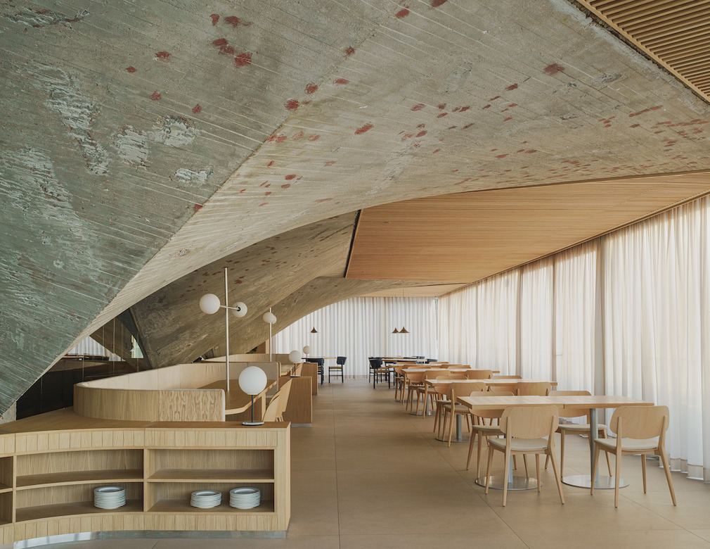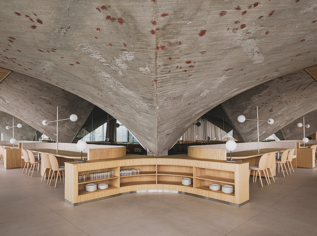 An architectural feat drawing from both brutalist and maritime inspirations, The Cantabrian Maritime Museum restaurant is nestled beneath a concrete canopy. Located in Santander, Spain, the restaurant was conceived by Zooco as part of an architectural complex that also includes an Oceanographic Center designed by Vicente Roig Forner and Ángel Hernández Morales, built between 1975 and 1978.